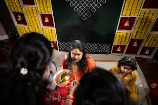 మగపెళ్ళివాళ్ళు కూడా ఆ రోజు ఉదయమే వాళ్ళింట్లో పెళ్ళికొడుకుని చేసుకుని మధ్యాహ్నం ఇక్కడకు వచ్చారు. ఇంట్లో అందరం పసుపు బట్టల్లోనూ, పెళ్ళికూతురు, పెళ్ళికొడుకు మాత్రం అరేంజ్ కలర్ బట్టల్లోనూ ముస్తాబయ్యారు. పెళ్ళికూతురు పువ్వులతో చేసిన అభరణాలు పెట్టుకుని గమ్మత్తుగా తయారయ్యింది.